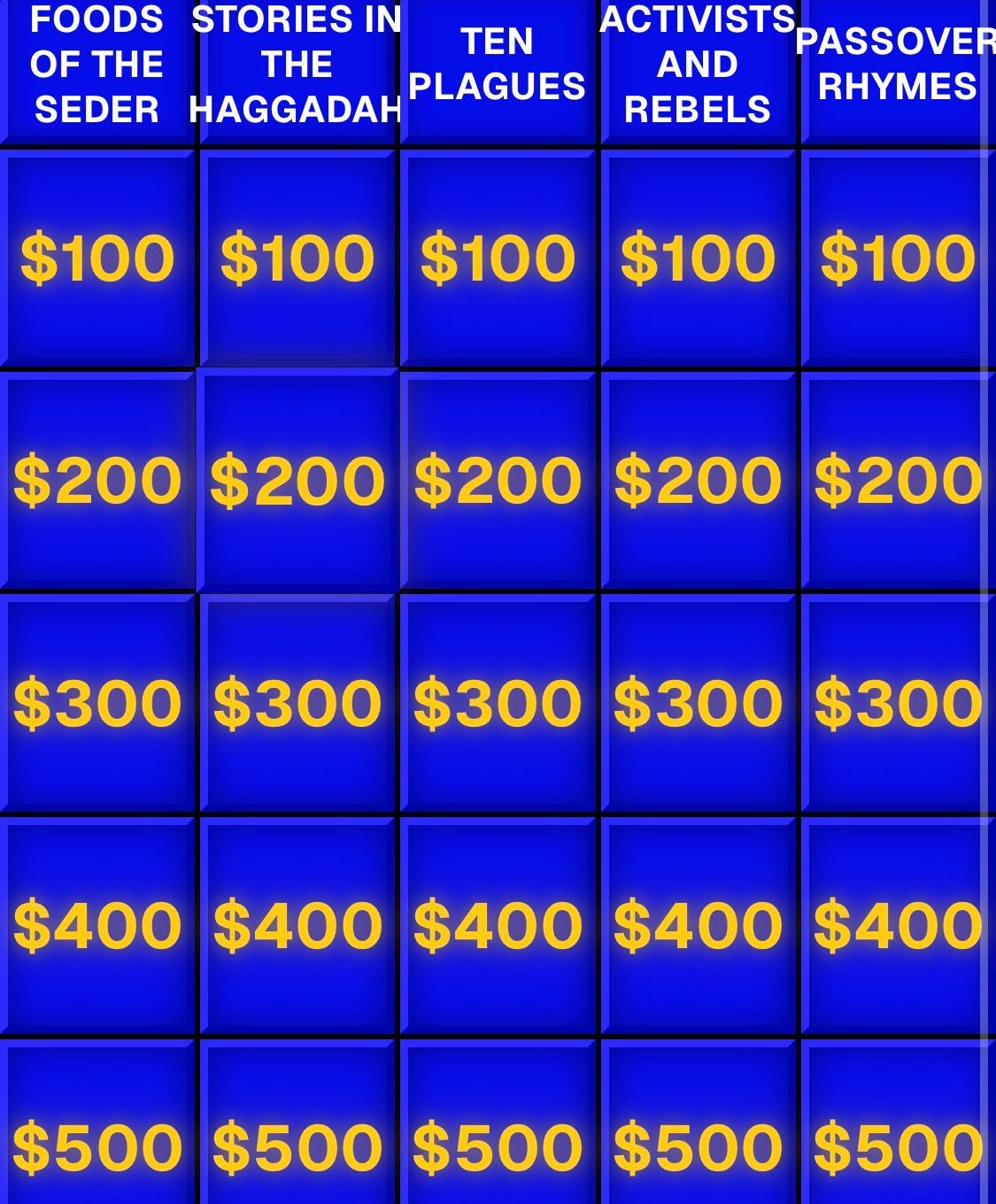 Let me know if you use Passover Jeopardy during your Seder
